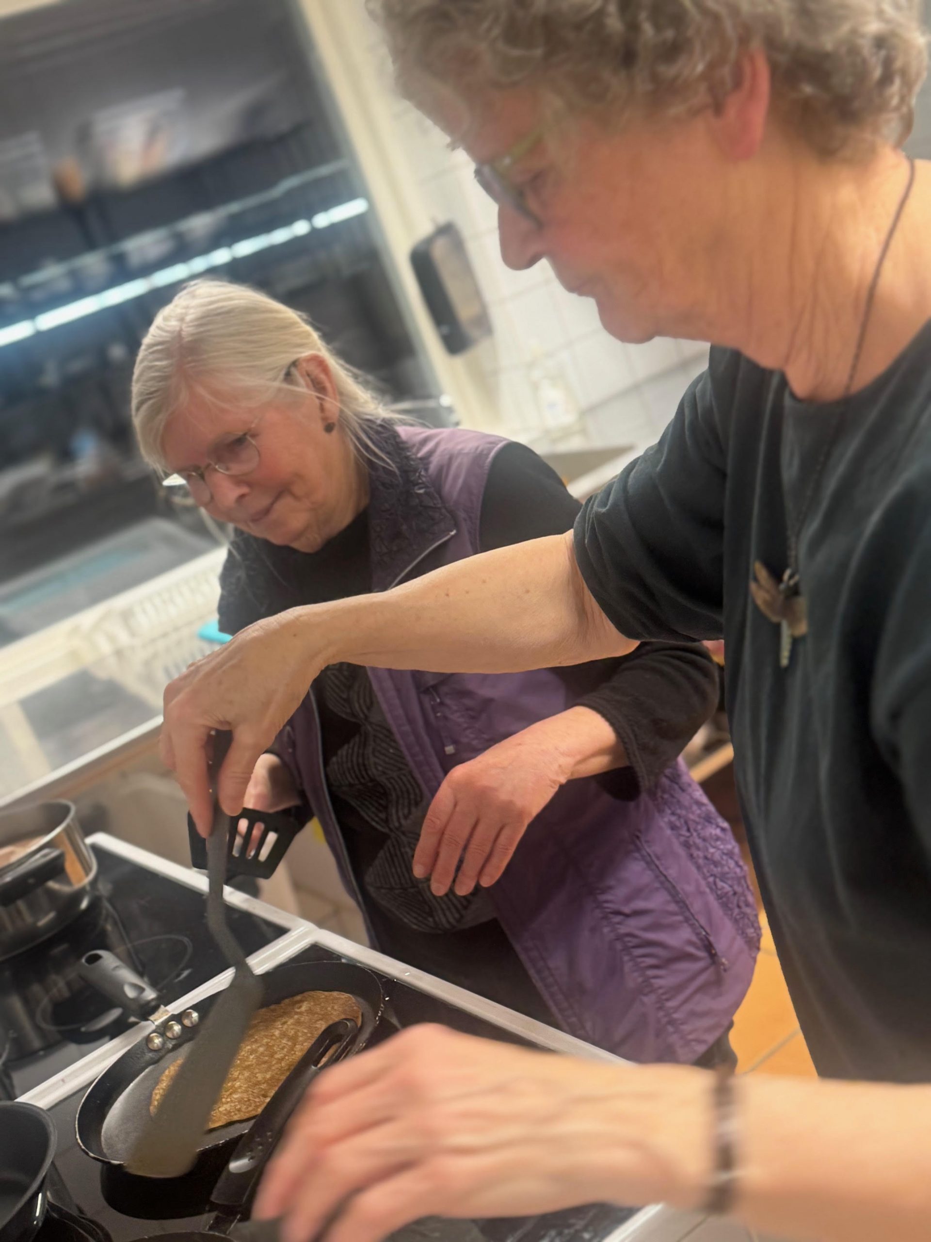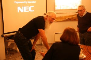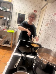 Formanden passer PowerPoint under Generalforsamlingen Der bages pandekager til godt 40 mennesker! Så spises der pandekager og drikkes kakao